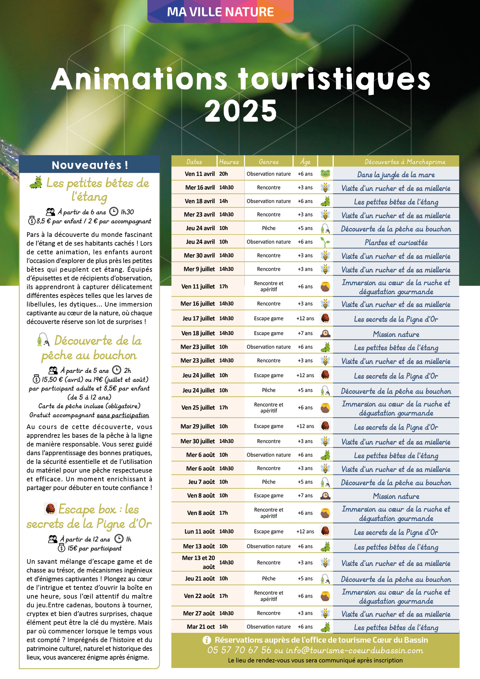 Depuis 2017, la commune a intégré l’Office de Tourisme Cœur du Bassin, avec comme objectif le développement de l’attractivité touristique de Marcheprime, et notamment le tourisme vert, via des activités nature et pédagogiques débutant dès le mois d’avril. Découvrez le programme des animations de la saison 2025 qui se déroulent dans notre commune !