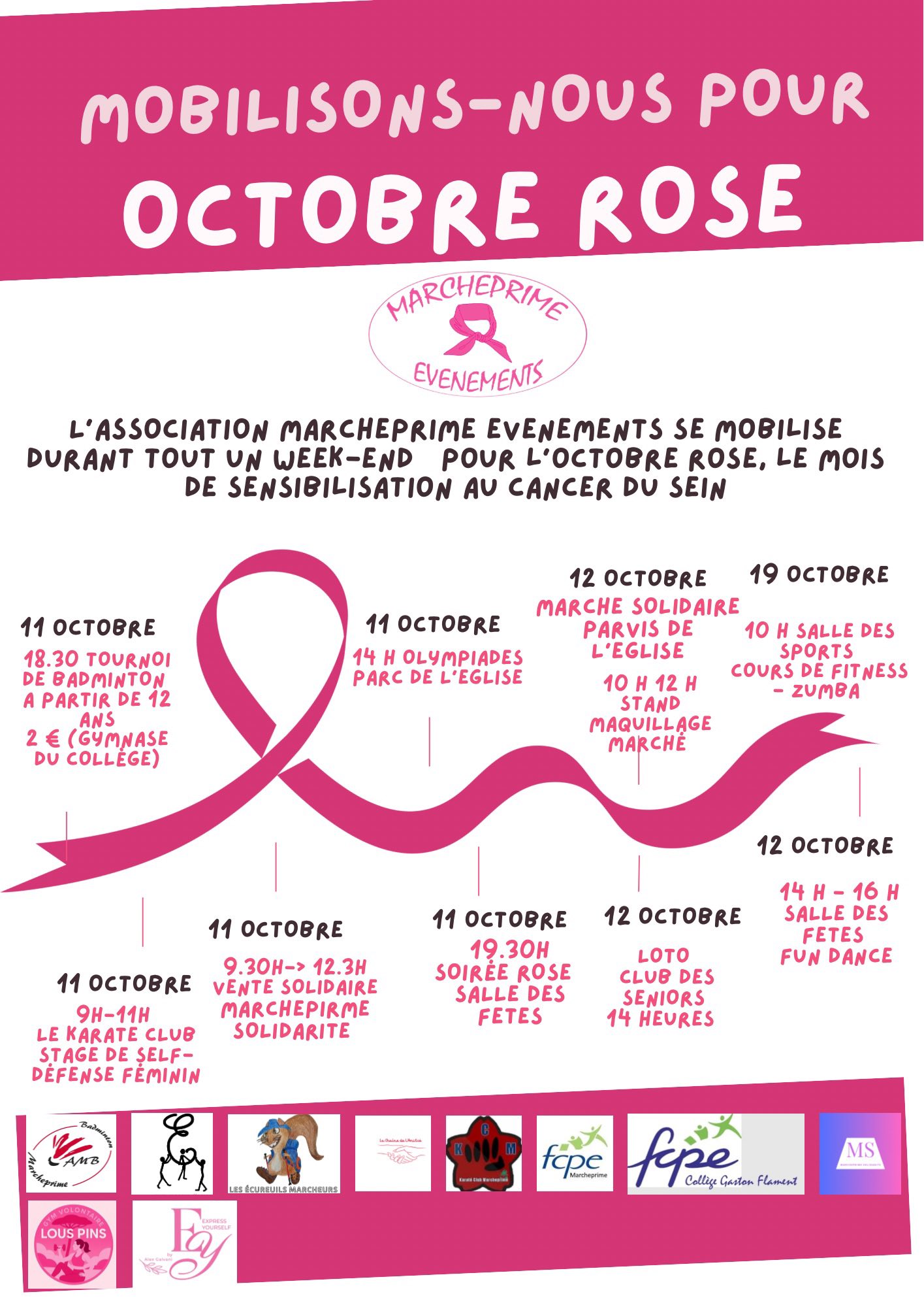 Comme chaque année, la ville se pare des couleurs d’Octobre Rose ! Marcheprime événements et de nombreuses les associations marcheprimaises vous ont préparé un vaste programme d’animations pour sensibiliser à la lutte contre le cancer du sein.