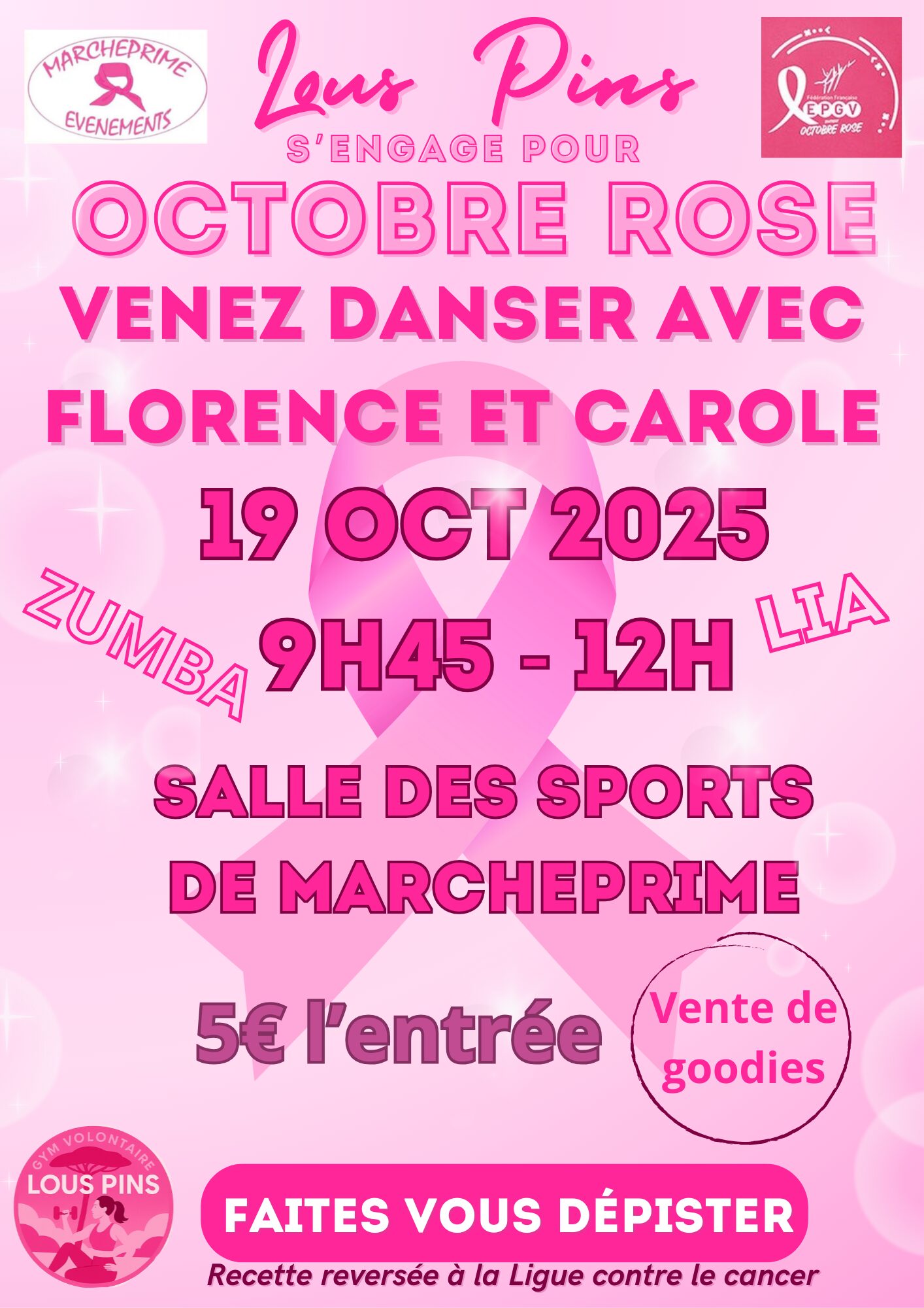 Dimanche 19 octobre, de 9h45 à 12h, salle des sports ZUMBA ET LIA / Venez danser avec Florence et Carole de GV Lous Pins – Marcheprime ! 5€ l’entrée / Vente de goodies