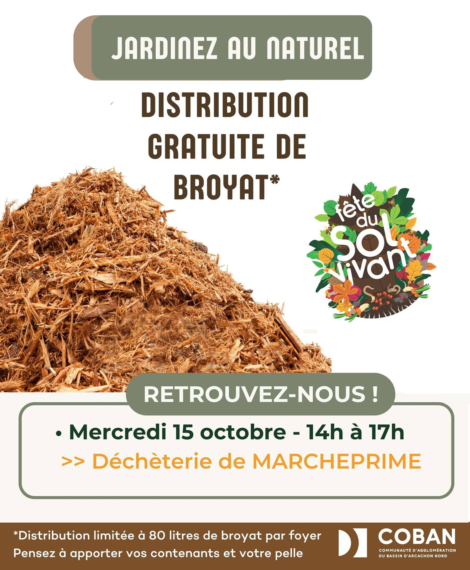 À l’occasion de la Fête du sol vivant 2025, la COBAN vous offre du broyat gratuit sur 3 dates et 3 lieux du Nord Bassin :