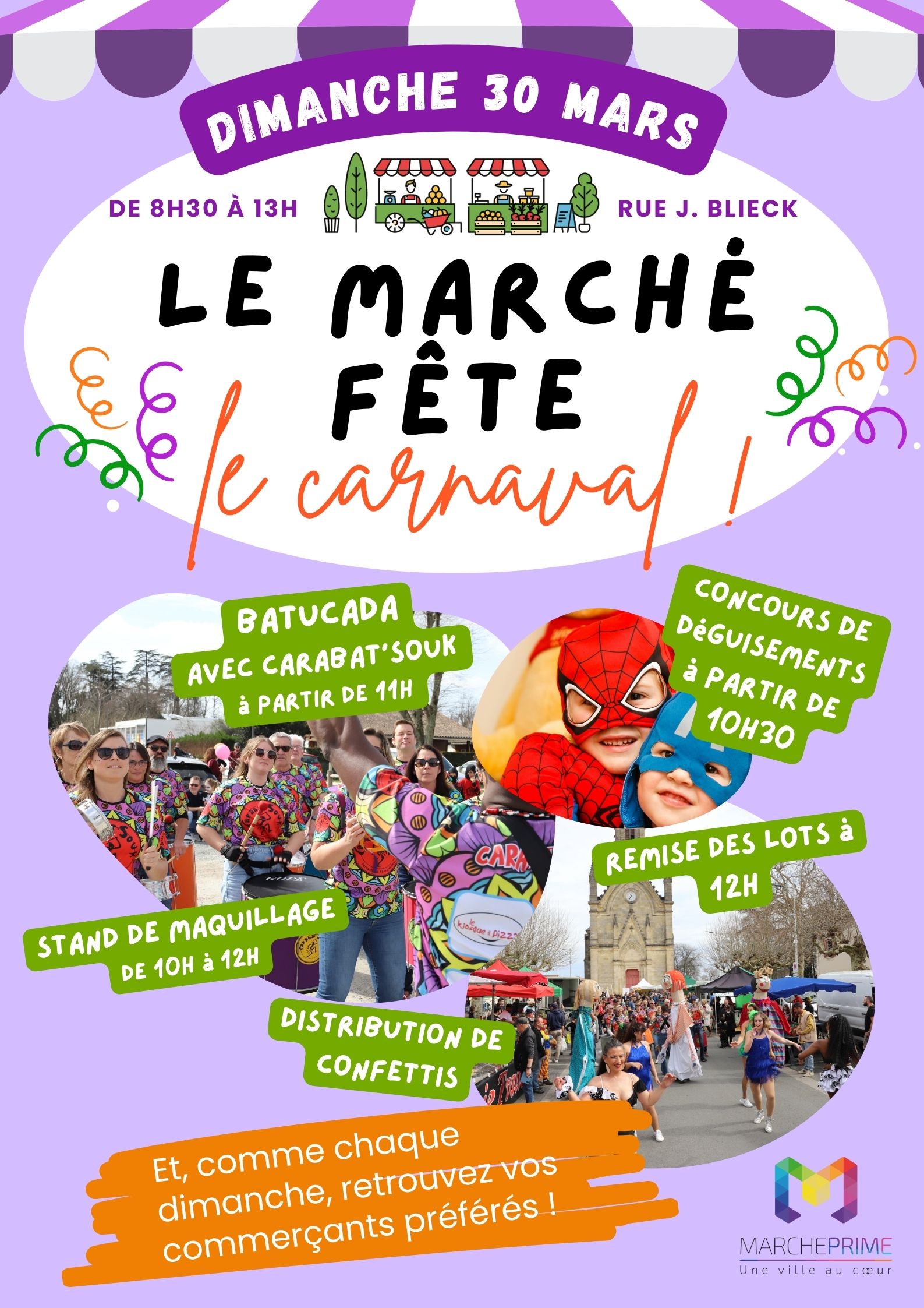 Le dimanche 30 mars, le marché municipal vous attend nombreux pour fêter le carnaval ! 🎉🎭🎸
