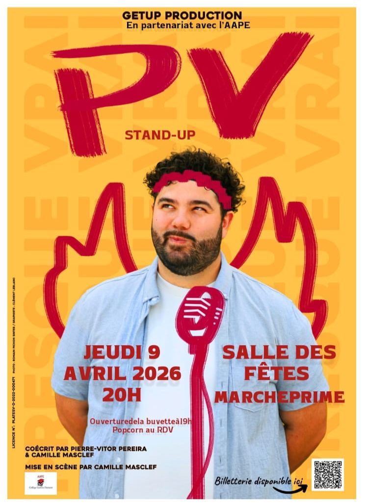 PV (Pierre-Vitor Pereira) nous fera l’honneur de venir jouer son spectacle » Presque Vrai » à la salle des fêtes de Marcheprime le jeudi 9 avril 2026 !