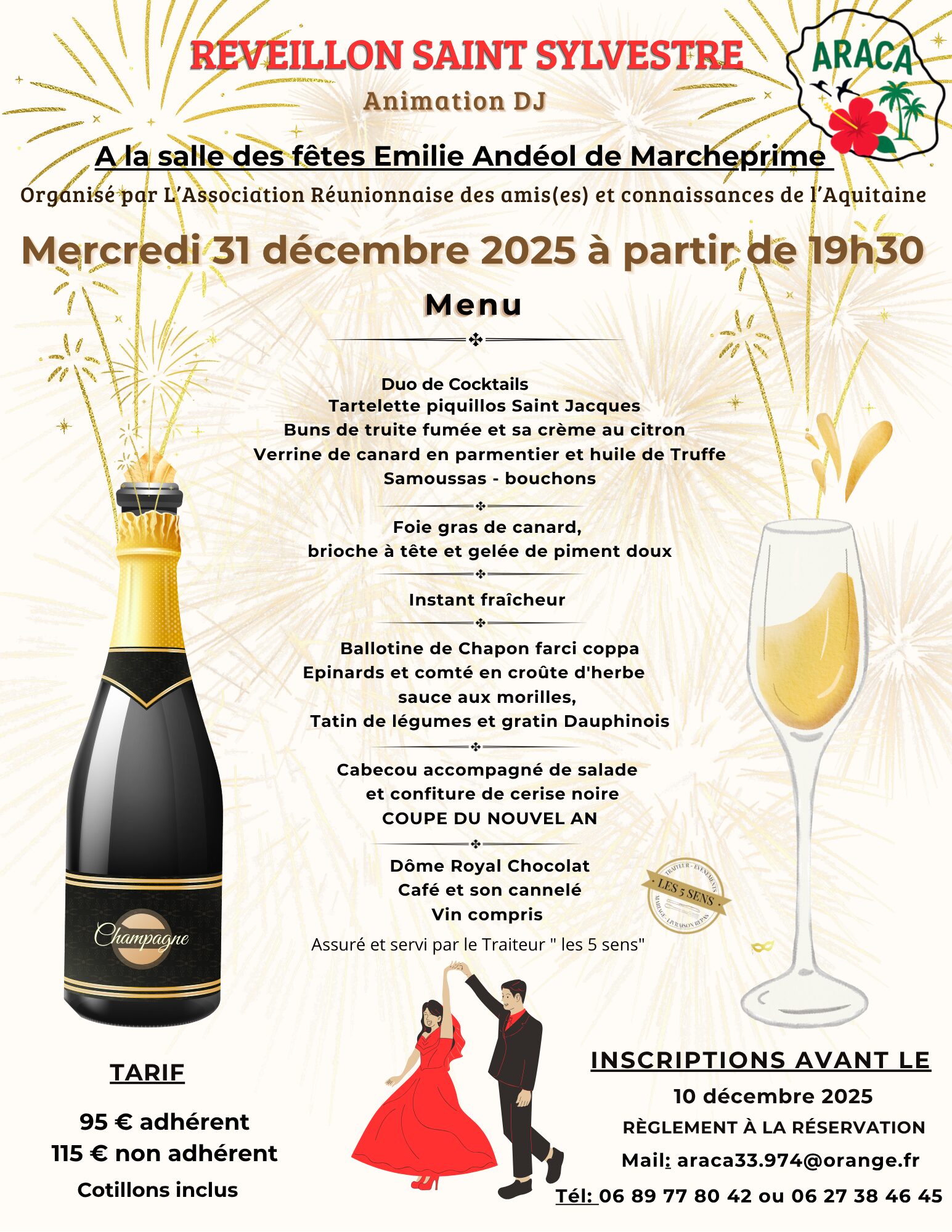 Un duo de cocktails soigneusement sélectionné par nos soins, un repas préparé et assuré par le traiteur « Les 5 Sens » ainsi qu’une animation DJ tout au long de la soirée agrémenté d’un florilège de cotillons, tout cela pour vous permettre de fêter ensemble jusqu’au bout de la nuit, la nouvelle année. Le nombre de places étant limité, merci par avance de votre réservation qui ne pourra être prise en compte qu’accompagnée de son règlement.